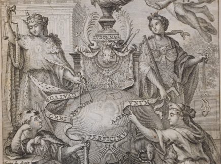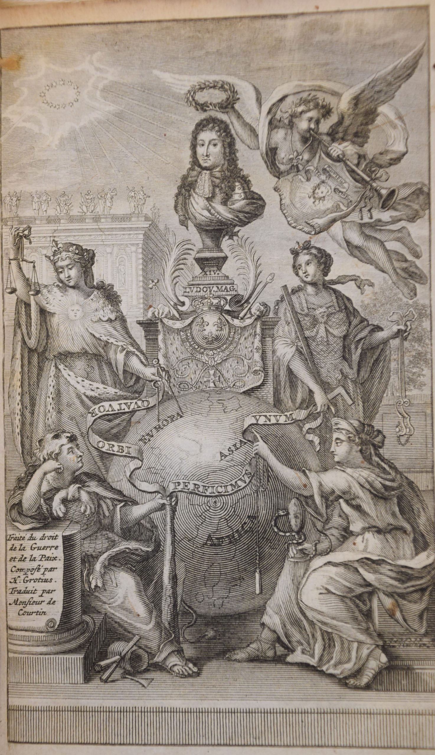 Knygą puošia priešlapio graviūra vaizduojanti Vienybės alegoriją, kurią skelbia juostoje išrašytas šūkis - Quattuor perficimus unum. Šį vienį sudaro keturios antikinės moterų figūros: viršuje kairėje, Justitita (teisingumas), apačioje kairėje besiilsinti, parimusi ant bulavos, galbūt žmonija, pavargusi nuo karo. Dešinėje viršuje, tikėtina, Fortuna, nes Renesanse paplito jos vaizdavimas su medžio lenta, kaip laivo vairo simboliu, o šioje alegorijoje ji galėjo vaizduoti karo laimėjimo ar konflikto išsprendimo sėkmę. O apačioje sėdinti Prudentia (išmintis) su savo atributais – gyvate ir veidrodžiu, vaizduojanti politinį ir moralinį atsargumą priimant sprendimus, vengiant karo ir stiprinant taiką. Ši ketveriukė ir yra tas vienis apie kurį kalba Grocijaus karo ir taikos teorija. Alegorijos viršuje pašlovintas šlovės Fama vainikuotas ne pats Grocijus, o Liudvikas XIV, nes būtent jis yra šiuo mokymu besivadovaujantis ir valdantis monarchas.