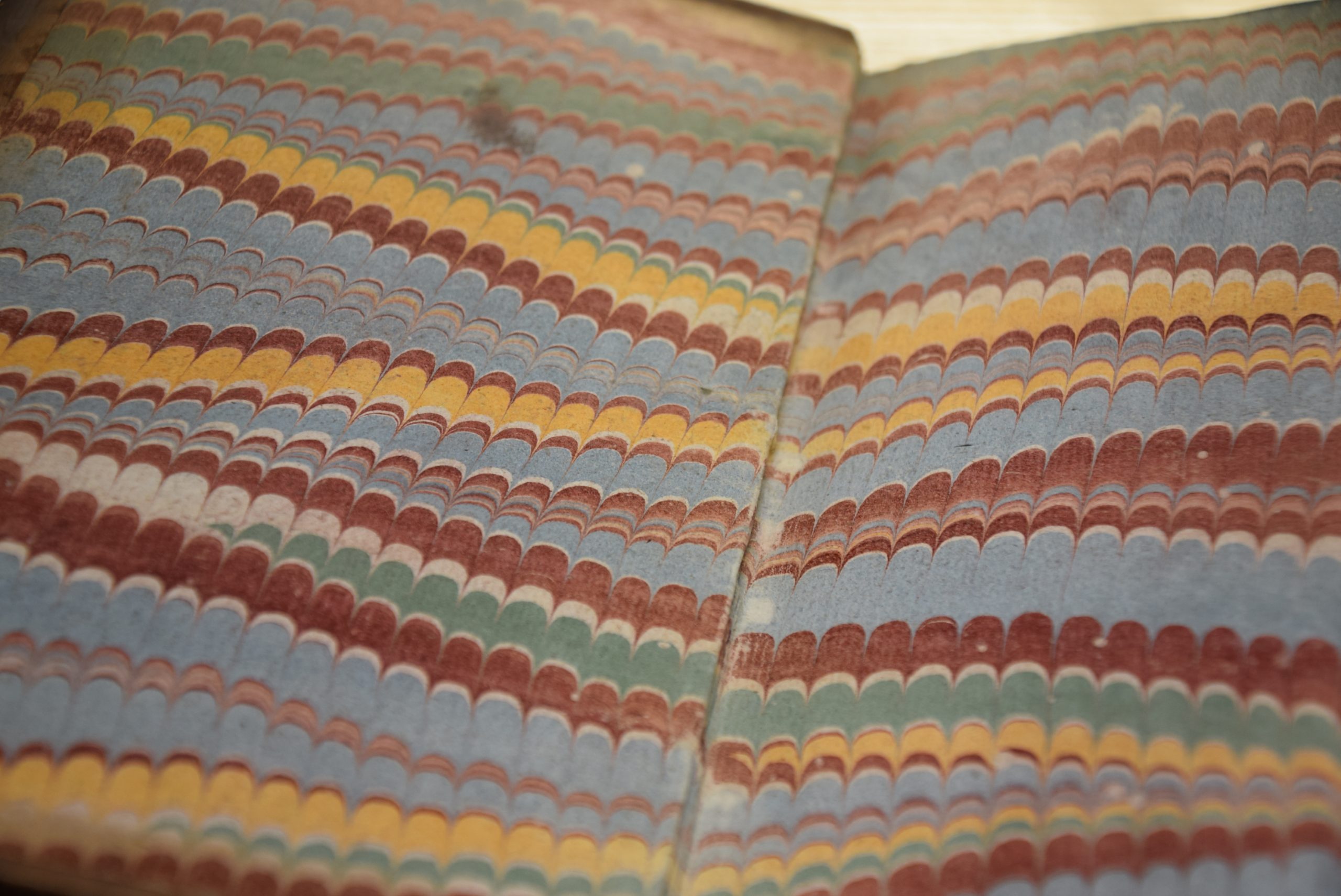 Knygos priešlapių marmuravimas. Bangelės išgaunamos, kai vonelėje, ant tirpalo paliejami dažai, o tuomet su įrankiais (metalinėmis šakutėmis) banguojama. Dažas išlieka stabilus, nes apatinis tirpalas būna standesnis. Belieka tik trumpam įmerkti lapą ir ant jo lieka veidrodinis atvaizdas. Tokiu pat principu marmuruojami ir jau surištos knygos lapų kraštai kol dar nėra uždėtas viršelis.