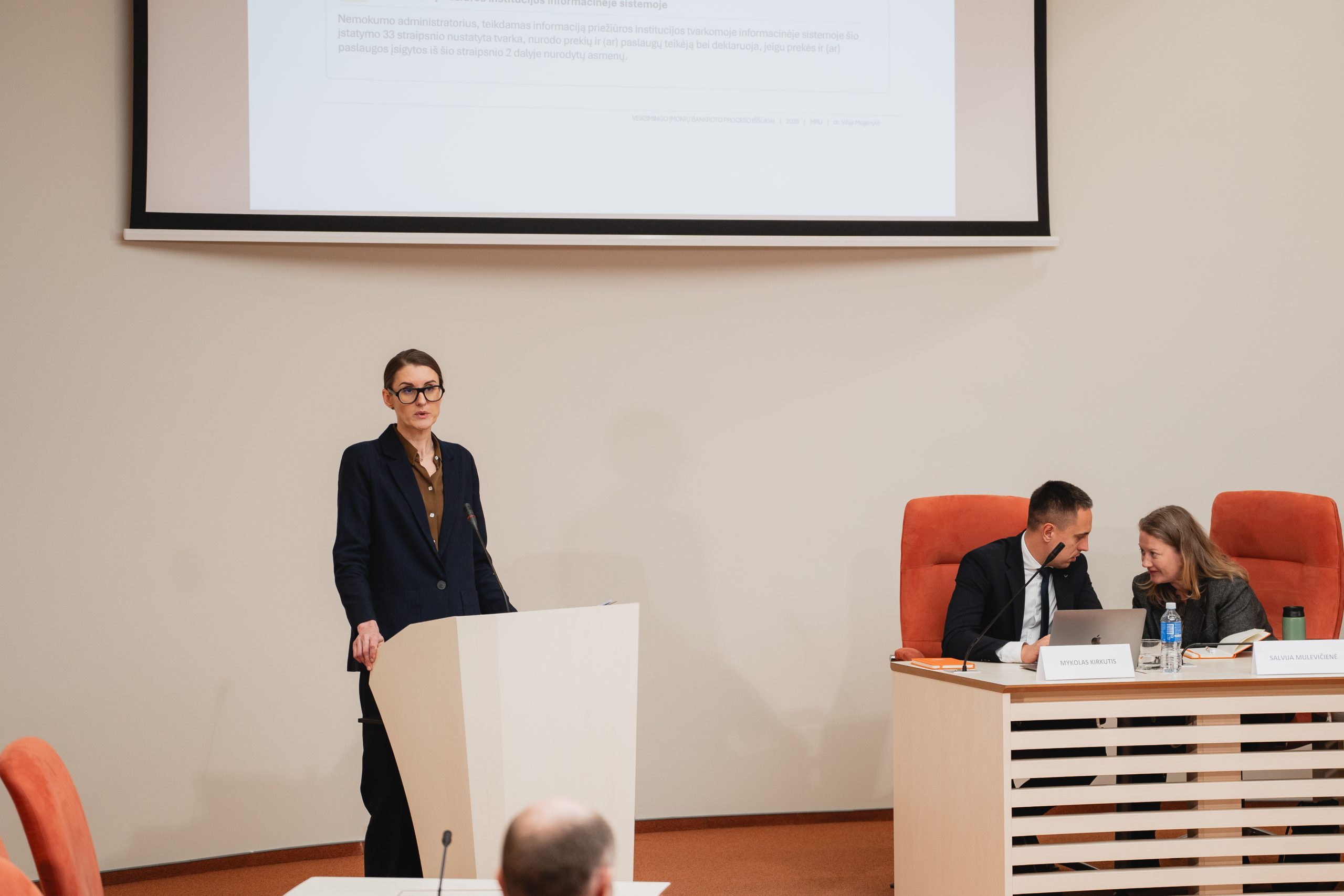 Nemokumo administratorių rūmų prezidiumo narė, teisininkė dr. Vilija Mogenytė pristatė, kaip veikia įmonių bankroto sistema ir kokie iššūkiai kyla nemokumo administratorių veikloje, taip pat kokie yra siūlomi naujausi nemokumo administratorių veiklą reglamentuojančių teisės aktų pakeitimai. Pranešėja akcentavo, kad nemokumo administratorius veikia krizės sąlygomis, todėl jis privalo turėti patikimų asmenų – finansininkų, archyvarų ir kt. – ratą; šie asmenys suteikia galimybę atidėti mokėjimus, toleruoja neatsiskaitymą, taip tam tikra prasme kredituodami bankroto procedūras.