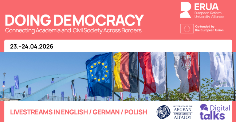 2026 m. balandžio 23 d. Europos reformų universitetų aljansas (ERUA) rengia ketvirtąjį „DigiTalk“ renginį „Doing Democracy – Dalyvaujamoji demokratija dezinformacijos laikais“. Šis renginys yra ERUA WP5 „Skaitmeninių pokalbių“ ciklo „Socialinių pokyčių siekimas ERUA vietos bendruomenėse ir regionuose“ dalis, koordinuojama Egėjo universiteto, ir vyks platesnės iniciatyvos „Doing Democracy: Connecting Academia and Civil Society Across Borders“ (balandžio 23–24 d.) kontekste. Tai Vokietijos ir Lenkijos iniciatyva, kurią įgyvendina Europos universitetas „Viadrina“ ir SWPS universitetas, siekianti skatinti dialogą tarp akademinės bendruomenės ir pilietinės visuomenės apie esminius demokratijos iššūkius.