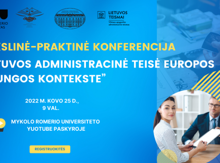 Mykolo Romerio universitetas (MRU) kovo 25 dieną, 9-12.30 valandomis, nuotoliniu būdu, MRU „YouTube“ paskyroje organizuoja mokslinę-praktinę konferenciją „Lietuvos administracinė teisė Europos Sąjungos kontekste“. Susitikime dalyvaus MRU Viešojo saugumo akademijos (VSA), Teisės mokyklos (TM), administracinių teismų, Akademinės etikos ir procedūrų bei Lietuvos administracinių ginčų komisijos (LAGK) atstovai.